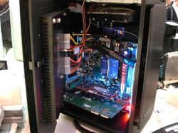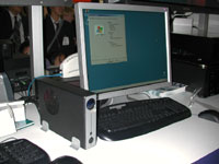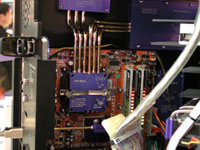Altech had another prototype case from Zalman, this one called the "Fatal1ty", apparently designed in association with the professional gamer of the same name. They had it stocked with ELSA 6600GT's in SLi - note the Zalman coolers that come standard on those cards. The motherboard is ABIT's AN8-SLI Fatal1ty, with Corsair Xpert RAM once again displaying a custom message. The bottom-mounted hard drives are on rubber standoffs to reduce vibration and you can apparently also mount hard drives on the inside of the door. Speaking of gamers, Altech were running a CS tournament to win an ABIT X800XT video card. When I left the final was underway between Hoss and King - congrats to whoever won. :)