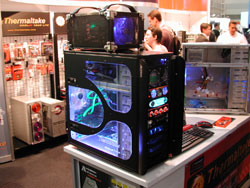 Thermaltake had the same large stand as last year and again successfully used a tricked-out case to attract attention. This year it was one of their "Armor" cases with the "Tribe" watercooling kit. This is an entirely external, self-contained kit with just coolant tubing going down to the case internals.