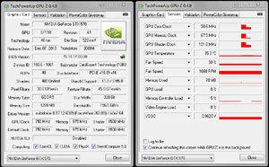 Gainward's GeForce GTX 570 Phantom features a default core clock of 750 MHz, shader of 1500 MHz, and memory running at 975 MHz (3900 MHz effective). Overclocking allowed us to increase the core to 900 MHz, shader to 1800 and memory to 1125 MHz (4500 MHz effective) making use of core voltage adjustments present in MSI's Afterburner software. Please note: PhysX is disabled for consistency between results. Default specifications as displayed by GPU-Z are on the left, while overclock settings and details are on the right.