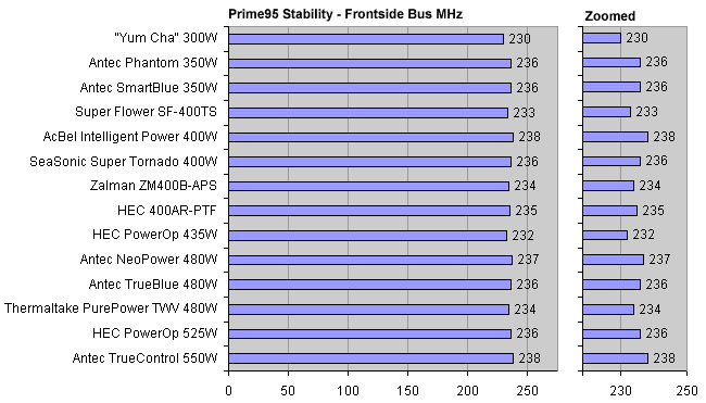 We used Prime95 as the final, most sensitive test. This is actually part of a distributed computing project to search for very large prime numbers. However, it's grown to be widely regarded as one of the most sensitive stability-testing tools available. In recognition of this usage, the authors have included a "Torture Test" mode which runs intensive numerical calculations and compares the calculated result with known correct results. If a difference is found, the program aborts and informs you of the error. It's highly sensitive to errors within the CPU, the cache or system memory. We used the default "Blend" mode and let it complete the first sequence of tests, for a bit over 10 minutes of continuous testing each run. Normally you would test overnight, or for 24 hours, but that time frame is impossible with the number of test runs we must complete. Any reported errors counted as a fail. The highest successful CPU FSB speed for each PSU was recorded.