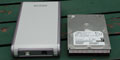 The unit itself is quite attractive - barely larger than the drive it encloses, with a metal cover and plastic ends. At one end you have the small USB connector and a 4-pin power connector I've not seen before. It's keyed to stop you doing anything silly and mis-connecting it, unless you try really hard. At the other end there are two LED's - one green to indicate the unit has power and a red one to indicate hard disk activity. The whole unit slots into the included stand to take up less desk space or can sit flat - perhaps on top of your case. Here we see the unit next to an IBM DeskStar 75GXP drive, to give you an idea of scale: