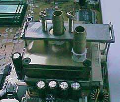 The mounting clip is kinda neat, in that it lets you vary the height of the unit - so you can mount it straight on the processor or slide a peltier underneath it. If you overtighten the screws the little clips on the side tend to slide into the plate and come apart from the unit. I guess this is a Good Thing as it stops you snapping the lugs off the socket. Before you ask, no, I don't know where to get these waterblocks in Australia. I got this from a friend who got it from somewhere in Taiwan (but is being obscure and not telling me exactly where). If anyone knows, give me a yell - I need another for my BP6, and I've had a lot of emails from people after them too.