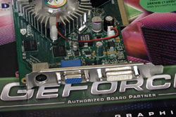 The card itself is fairly unexciting too, but the eye is drawn to the smaller black heatsink on the front. Under here lurks the PCI-AGP bridge, allowing AGP users to enjoy a GPU that was designed for PCI-E connectivity. The main GPU cooler isn't as impressive as the high-end cards, but again this suits the mid-range character of the card. My only concern might be that aftermarket coolers (including water-coolers) might be fouled by, or fail to properly cool, the PCI-AGP bridge chip. Again though, the target market for this card is probably not too inclined to overclock it or even bother changing the stock cooler. It's quiet and the card seems to run cool enough as standard.