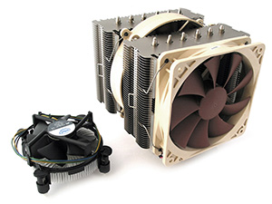 So how big really is this cooler? Well the Noctua NH-D14 weighs just over 1240 grams (1.24KG) and measures in at 160mm (H) x 158mm (D) x 140mm (W) with both fans attached. However if numbers aren't your game, in the left photo below we've compared it to a mainstream Intel LGA775 heatsink you may find alongside your newly purchased processor.