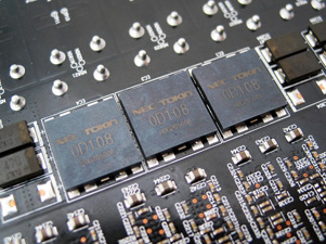 To complement the voltage adjustment available in software, MSI include Mem Voltage, GPU Voltage, PWM Clock Tuner and OCP Unlocker switches near the end of the card to help tune PWM clock ripple elimination, instantly adjust voltages without delay, and remove overclock protection for a variety of extreme overclocking scenarios. In addition, multiple NEC-Tokin 0D108 Proadilizer chips have been added to handle decoupling at higher frequencies, while also reducing electrical impedance and reducing space taken by the usual bank of capacitors that are required for decoupling.