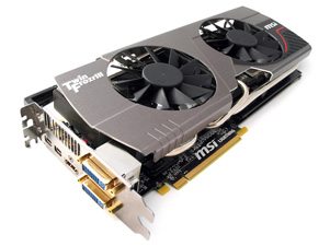 One of the most obvious ways that MSI's card differs from the reference cards, apart from the PCB, is the cooling system. The card sports MSI's own next-generation TwinFrozr III thermal cooling solution with five heatpipes to transfer the heat load, via a nickel-plater copper base, to a high-density aluminium heatsink which is cooled by two 9cm PWM controlled fans.
