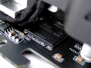 On the memory side, the ASUS GTX 560 DirectCU II TOP features Samsung 6th generation K4G10325FE-HC04 GDDR5 memory specified to run at 1250 MHz (5000 MHz GDDR5 effective) with 1.5V. No heatsinks are provided to keep the memory cool apart from the airflow from the main heatsink; however critical power circuitry is covered by a black heatsink matching the rest of card's colour scheme.